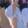 朱白金チームの続き。少し雨はやんできたか、傘もささずに濡れたままの応援風景に感動。トランペットプカプカ太鼓どんどん係もチアっ娘兼用。後半は紫かかった青に白赤アクセントユニチーム。一通りの応援を終えてちょっと休憩。今どきの娘、私服ではミニスカや短パンでの外出も多いでしょうからスパッツが見えていてもなんとも感じないのかスカートがめくれてスパッツチラ見えのままで休憩して居る娘がいます。